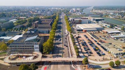 • Tekst: La passerelle blanche pour vélos au-dessus du Westerring de Genk se remarque surtout par son aspect tourbillonnant. Deux éléments tubulaires élancés serpentent au-dessus de la route, tout comme pour un rollercoaster. La forme du pont a été adaptée de manière minutieuse aux forces qu’il subit. Les arcs et les assemblages de charpente coopèrent et font en sorte d’utiliser optimalement (la force de) chaque kilo d’acier (S355 J2). Le résultat de cet exercice est une construction affinée et fluctuante.
