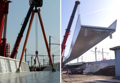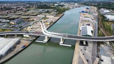 • Tekst: Dans le cadre de la réalisation de la plateforme multimodale Trilogiport à Hermalle-sous-Argenteau, un nouveau pont, d’une longueur totale d’environ 300 m, a été construit sur la Meuse. Sa plus grande travée présente une longueur de 88 m. La structure porteuse est constituée de deux poutres métalliques à hauteur variable (aciers S355 et S460), reliées par une dalle en béton connectée sur des pièces de pont métalliques (S355).