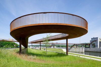 • Tekst: D’une portée de 22 m pour 4 m de large, cette passerelle à Verviers s’articule autour d’un profilé reconstitué soudé (PRS) à hauteur variable qui délimite deux cheminements, un cheminement direct et une promenade en arc. Le support du platelage s’étend quant à lui en porte-à-faux de part et d’autre sur cette poutre considérée comme la colonne vertébrale de la passerelle. La torsion engendrée par des chargements dissymétriques est reprise par un arc déconstruit formé des tubes latéraux : l’un rectiligne assure le rôle de tirant et l’autre selon la forme de l’arc.