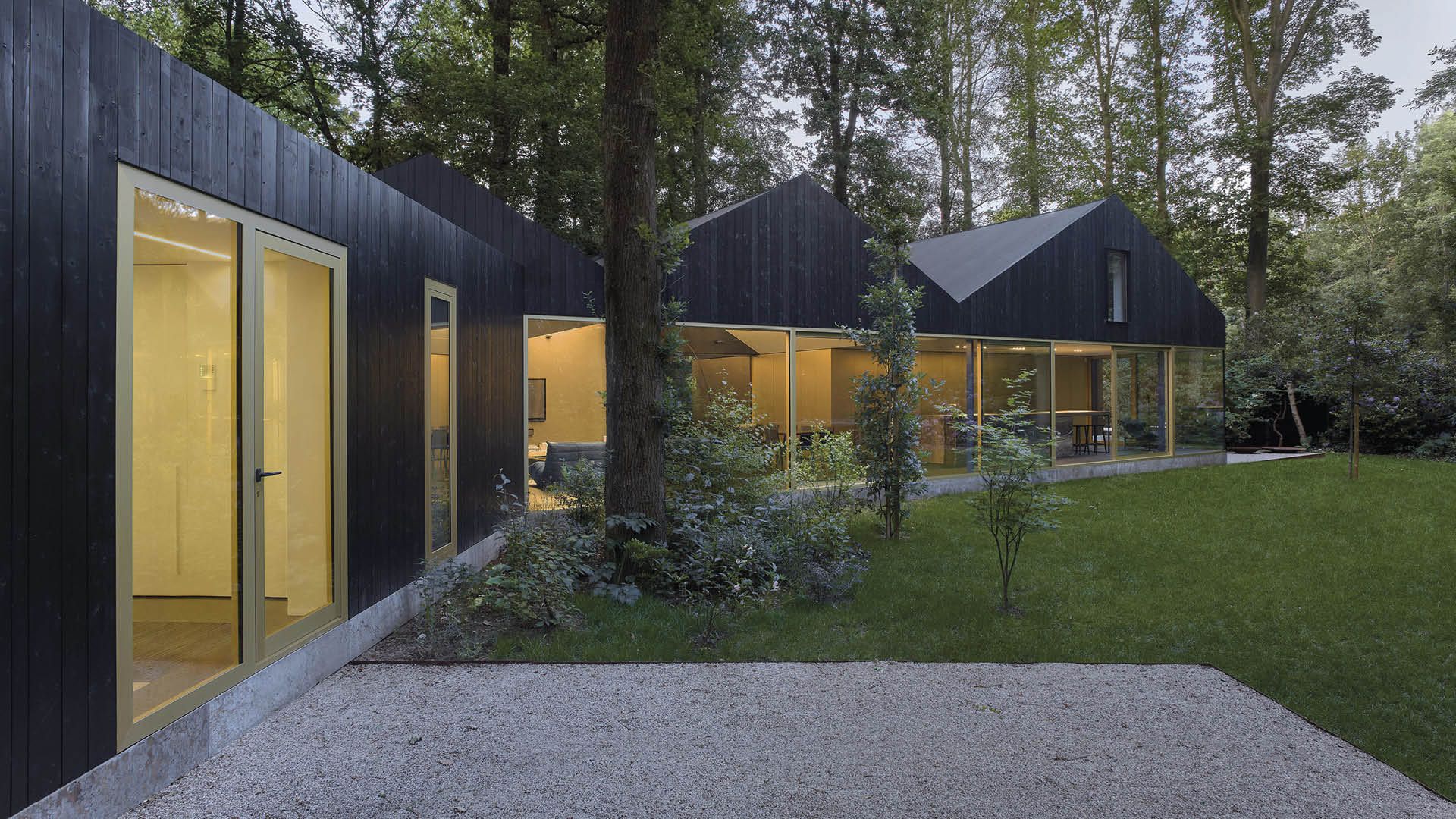 Cet ancien chalet en bois a été transformé en une maison individuelle contemporaine, la volumétrie de l’extension étant adaptée au positionnement des chênes environnants.