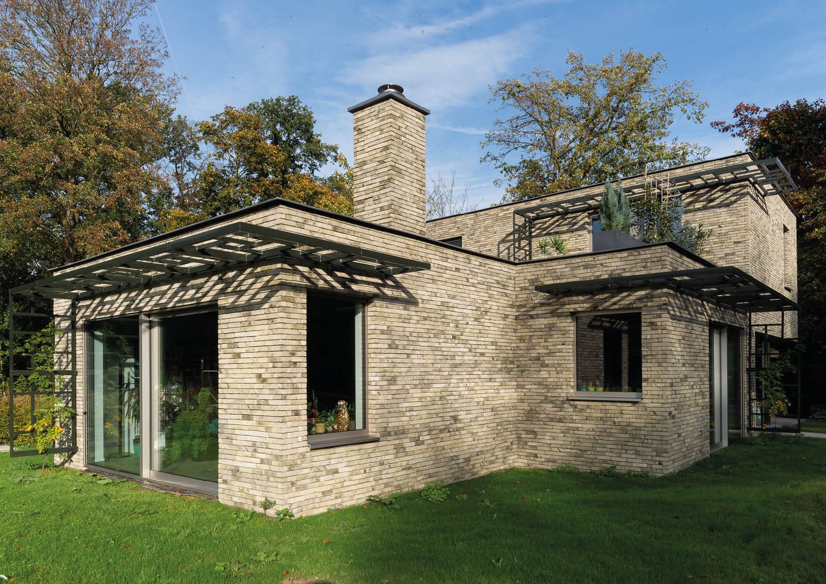 Grâce à sa forme, à l'utilisation judicieuse des matériaux et au choix spécifique des couleurs, cette maison unifamiliale, qui abrite également un bureau d’architecture, s'intègre parfaitement dans son environnement verdoyant. L'idée était d'éviter la surchauffe par les fenêtres vitrées orientées au sud et à l'ouest grâce à des plantes grimpantes, offrant ombre et fraicheur, sur trois auvents en acier. Ils se composent chacun de trois plans, divisés en segments avec un motif récurrent et suspendus entre des ailettes en acier fixées au gros oeuvre.
