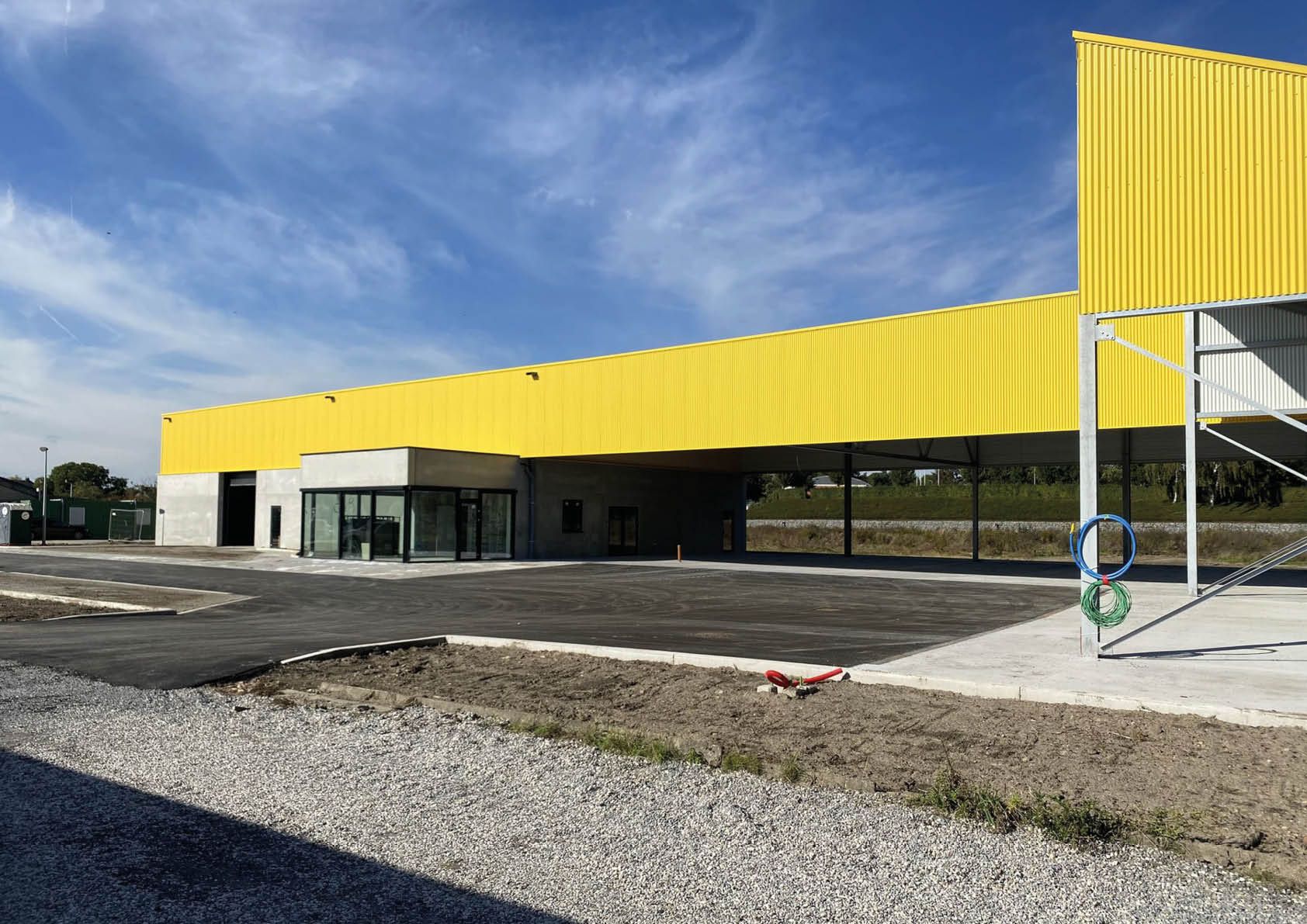 Le bâtiment se scinde en deux, avec le hangar d'un côté et l'auvent de l'autre.  Au fond de l'abri, une "plinthe" en panneaux de béton forme un bel ensemble avec les blocs de béton pour le stockage du sel de voirie. Le volume supérieur du bâtiment s'étend comme un auvent au-dessus du parking où seront garées toutes les voitures de l'entreprise. Les tôles d'acier profilées procurent au bâtiment un aspect frais et contemporain. Les cadres de fenêtres et les portails en aluminium noir complètent le logo noir et jaune de Kapelle-op-den-Bos.