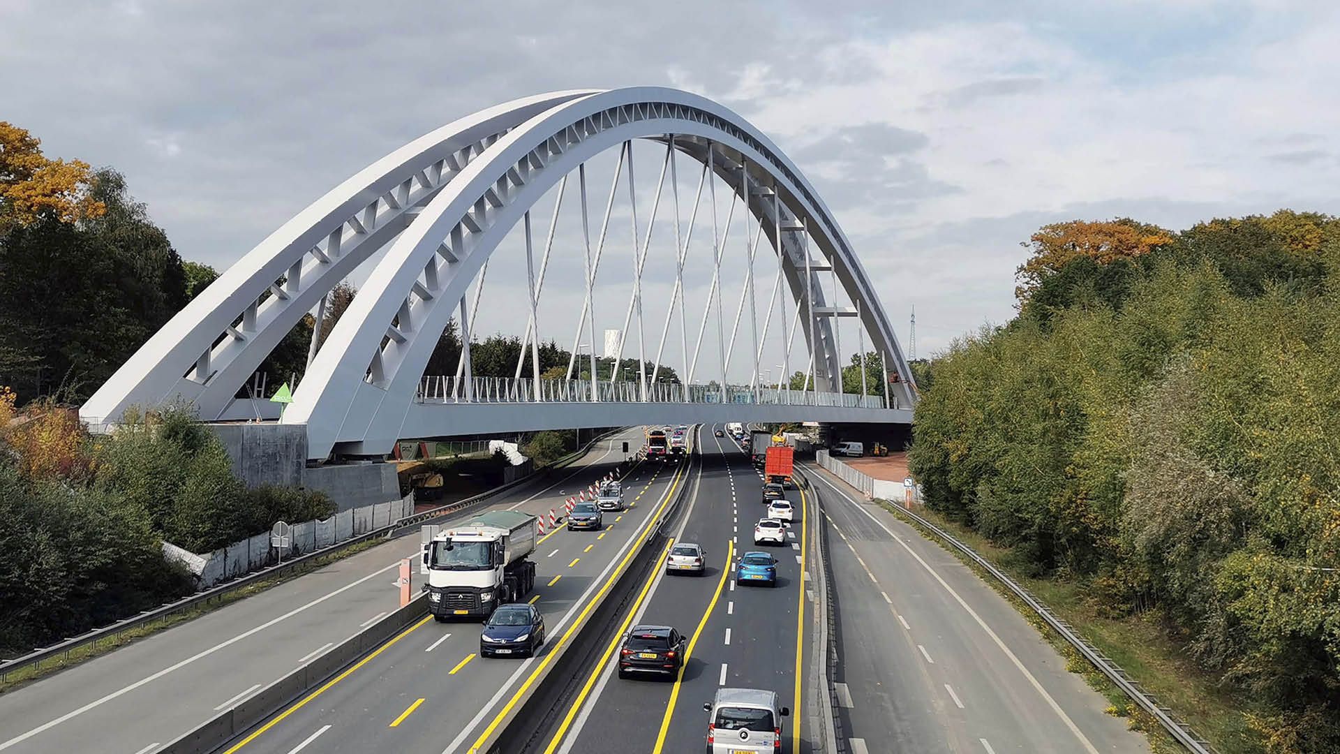 Comme l’ouvrage passe au-dessus de l’autoroute avec une hauteur libre de seulement 5 m, le choix a été fait de limiter au strict minimum les dimensions des poutres principales inférieures, tout en dédoublant les arcs pour maximiser leur inertie.