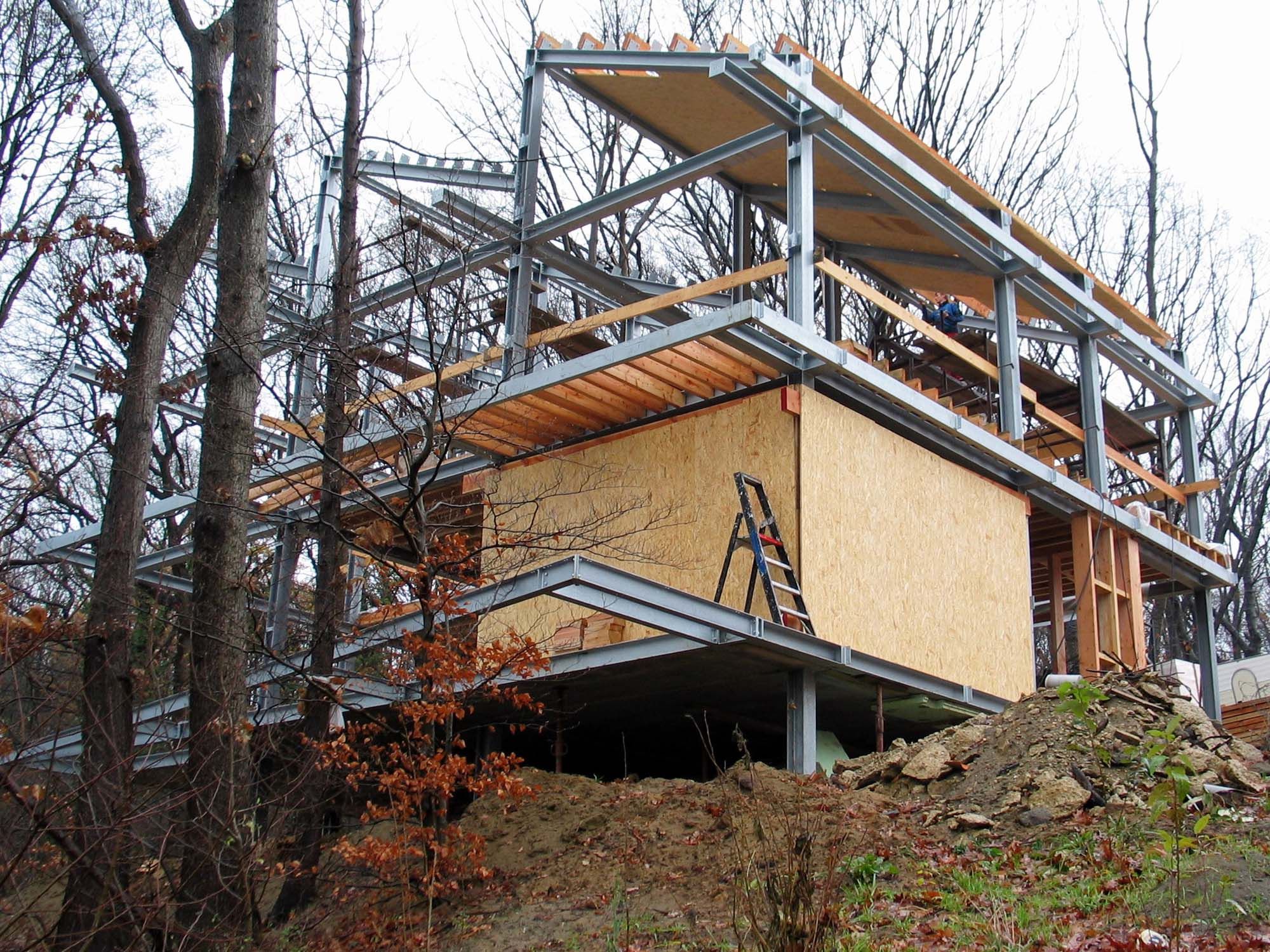 Cette habitation unifamiliale a été érigée sur une parcelle fortement en pente. L’habitation est principalement orientée est-ouest, de manière à profiter au maximum de l’ensoleillement tout en évitant la surchauffe. Du fait de la pente, les pièces d’habitation se situent entre les cimes des arbres, ce qui permet de suivre de près le changement des saisons.
