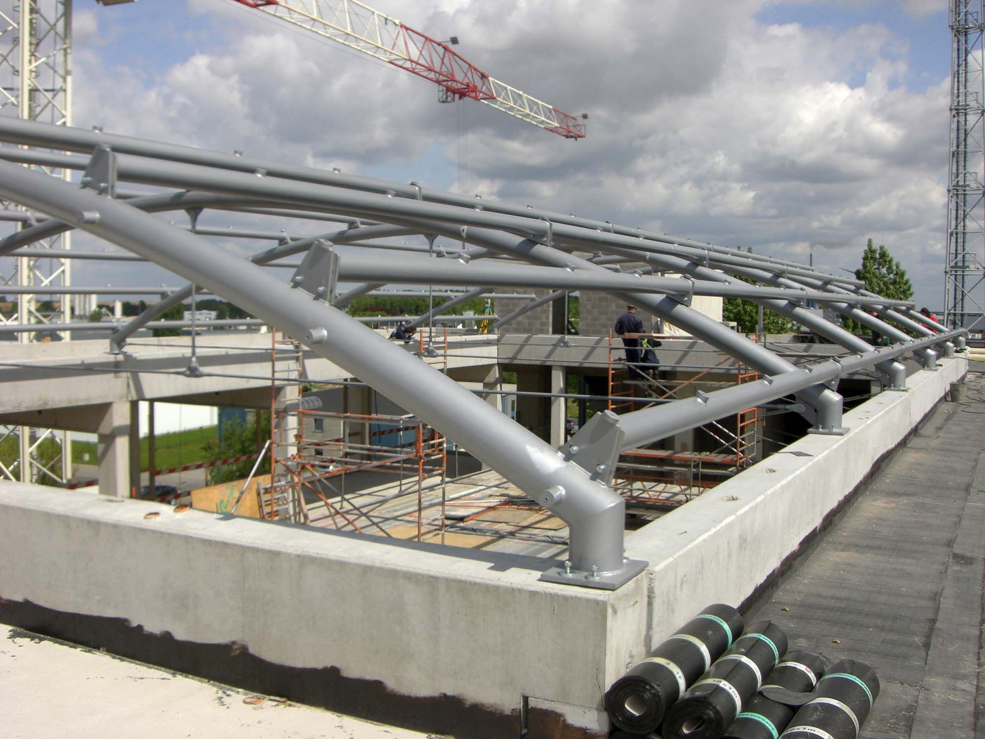 Pour la construction d’un entrepôt flexible, l’architecte a conçu un complexe à la mise en scène subtile. Le grand apport de lumière y joue un rôle important. Pour y parvenir, un atrium avec jardin d’hiver a été construit. Celui-ci est surmonté d’une coupole de plus de 350 m². L’attention est attirée par le bâtiment de bureaux rectangulaires et des bureaux paysagers, avec en leur centre une cour intérieure végétale couverte de verre. La toiture en vitrail d’acier et la façade avant en verre laissent pénétrer la lumière du jour. La structure portante du toit de l’atrium est constituée de tubes ronds qui ont dû être produits et montés avec une extrême minutie afin d’éviter les tensions dans le verre. La coupole de l’atrium mesure 14,23 x 25,15 m et pèse moins de 10 tonnes. L’acier combine toutes les facettes qui garantissent une structure de toit légère, solide et flexible.