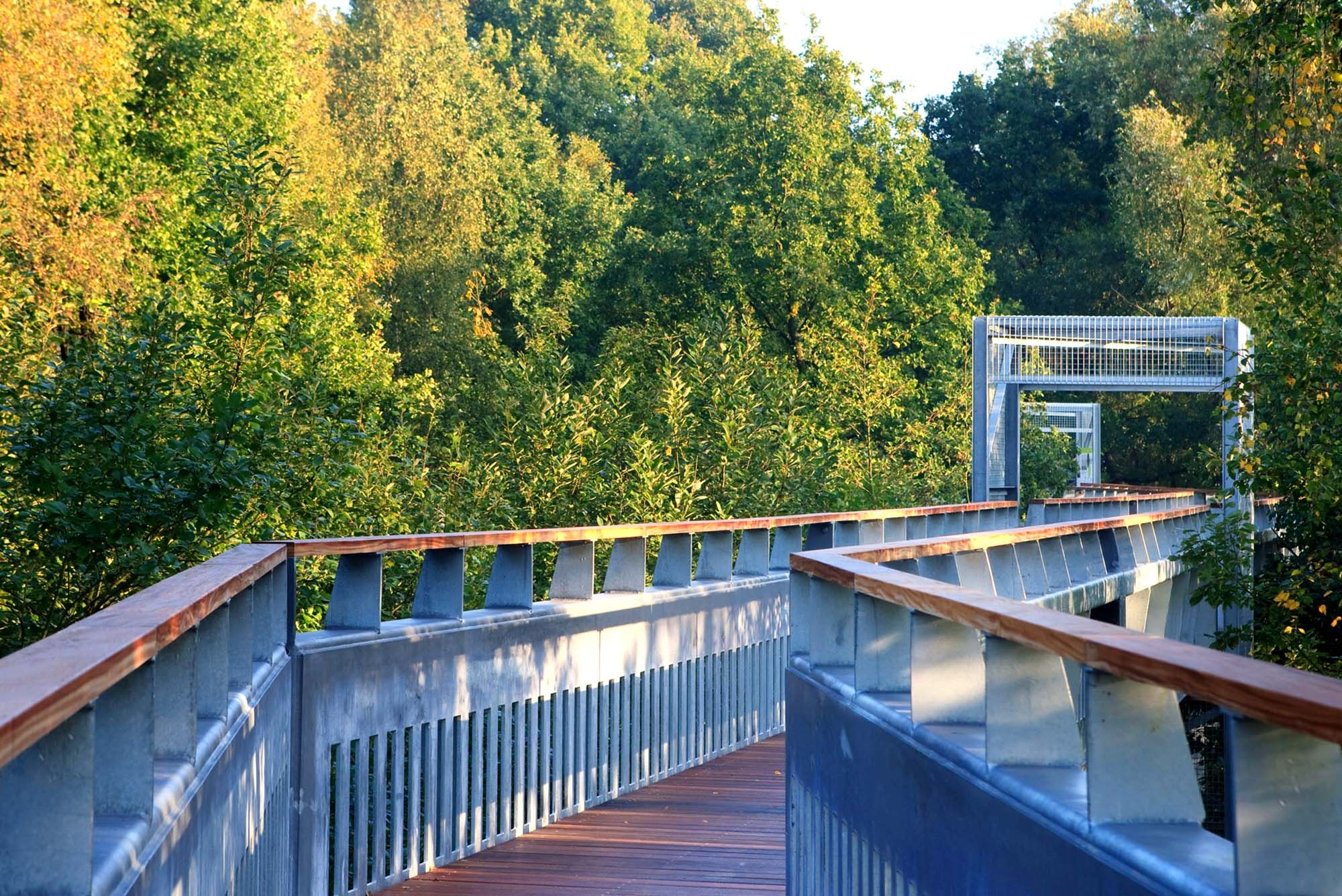 Le domaine ‘‘t Greven’ à Eisden est l’épicentre d’un spectaculaire affaissement minier. Le sol se situe plus de 10 m sous son niveau d’origine. Depuis la berge du Zuid-Willemsvaart - 11,50 m de hauteur à cet endroit - part un sentier de balade en acier qui traverse la couronne des arbres. L’acier a été choisi pour la structure. Elle est constituée d’éléments de passerelle, chacun composé de deux parties boulonnées entre elles. Les éléments de passerelle sont alternativement posés sur une tour et un pilier. Les piliers reprennent les efforts verticaux, les tours reprennent les efforts verticaux et horizontaux. Les garde-corps sont construits comme une poutre assemblée, dont l’âme est percée de manière à permettre aux petits enfants d’observer les environs. Les tours sont revêtues d’un treillis métallique permettant aux plantes grimpantes de s’y accrocher et aux tours de se fondre dans la nature.