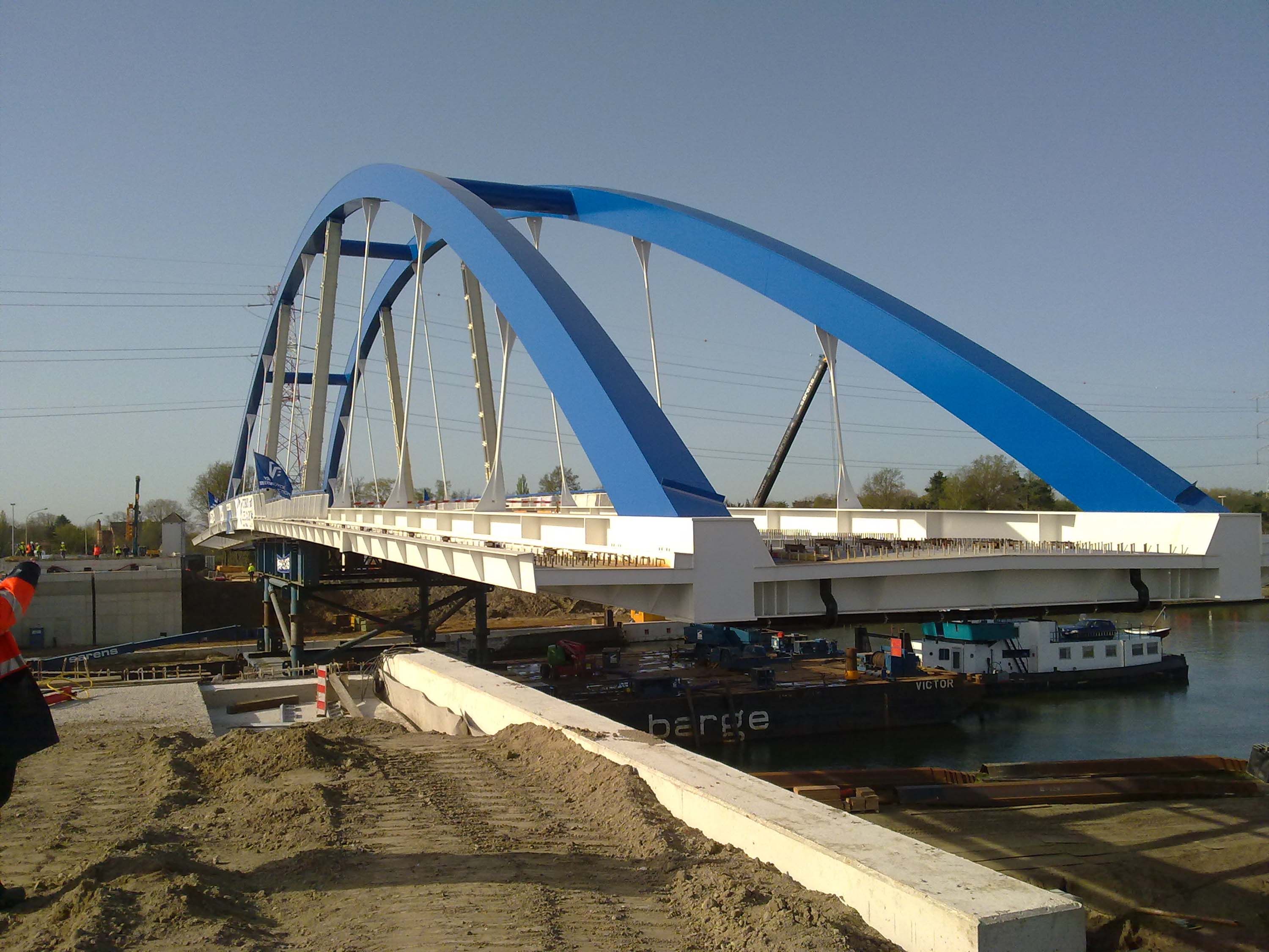 Het brugdek en de bogen werden over het water aangevoerd naar een assemblageterrein en daar volledig afgewerkt. De plaatsing van de nieuwe brug was een technisch hoogstandje en een langdurig preciesiewerk. Tijdens de invaaroperatie werd de brug in haar geheel op de nieuwe landhoofden geplaatst, waarna het betonnen wegdek kon worden afgewerkt.