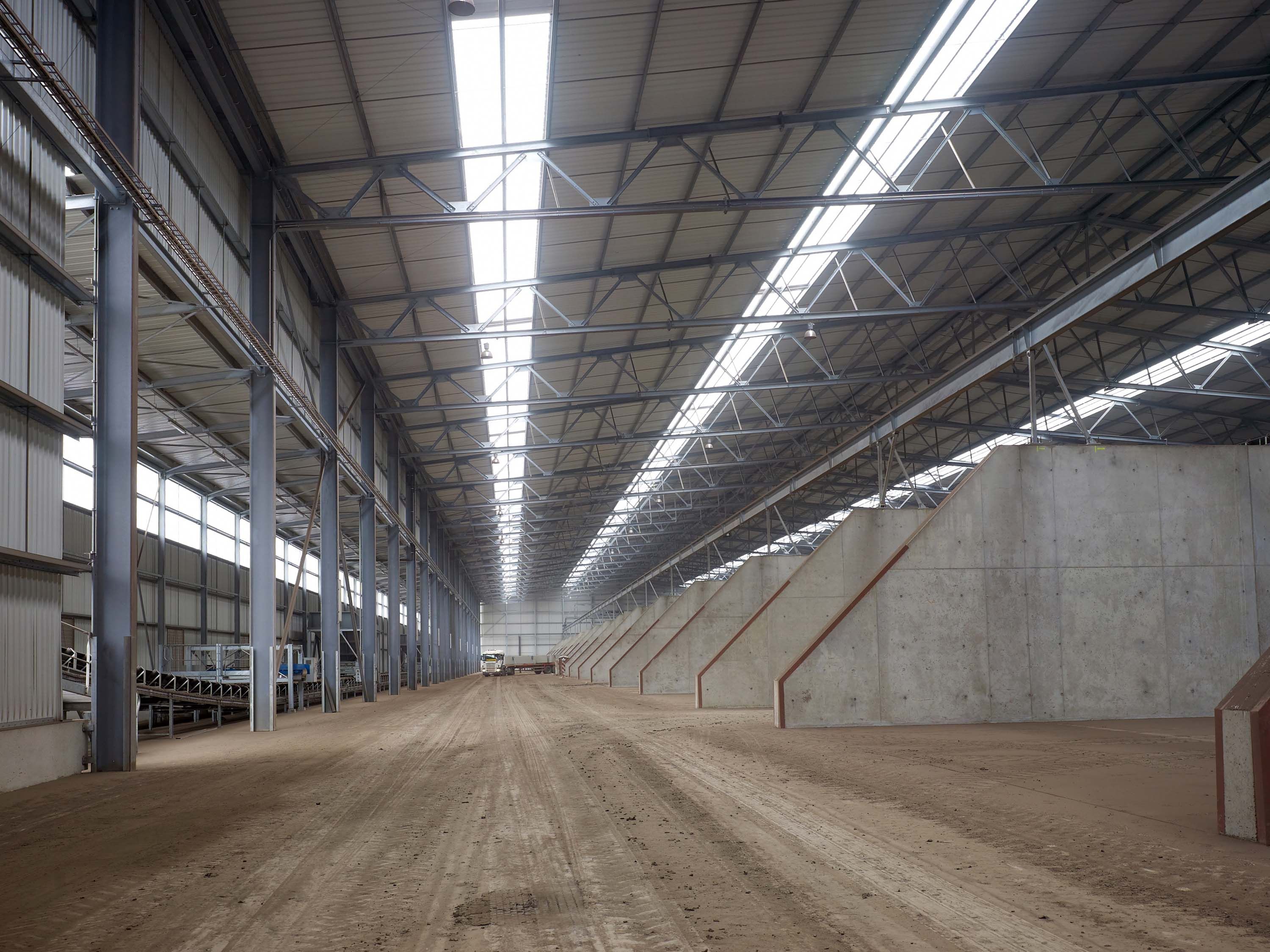 Het dak en de wand van de loods zijn niet geïsoleerd. Om de onderhoudskost tot een minimum te beperken en omwille van redenen van duurzaamheid, werd hier al snel gekozen voor een thermisch verzinkte structuur.