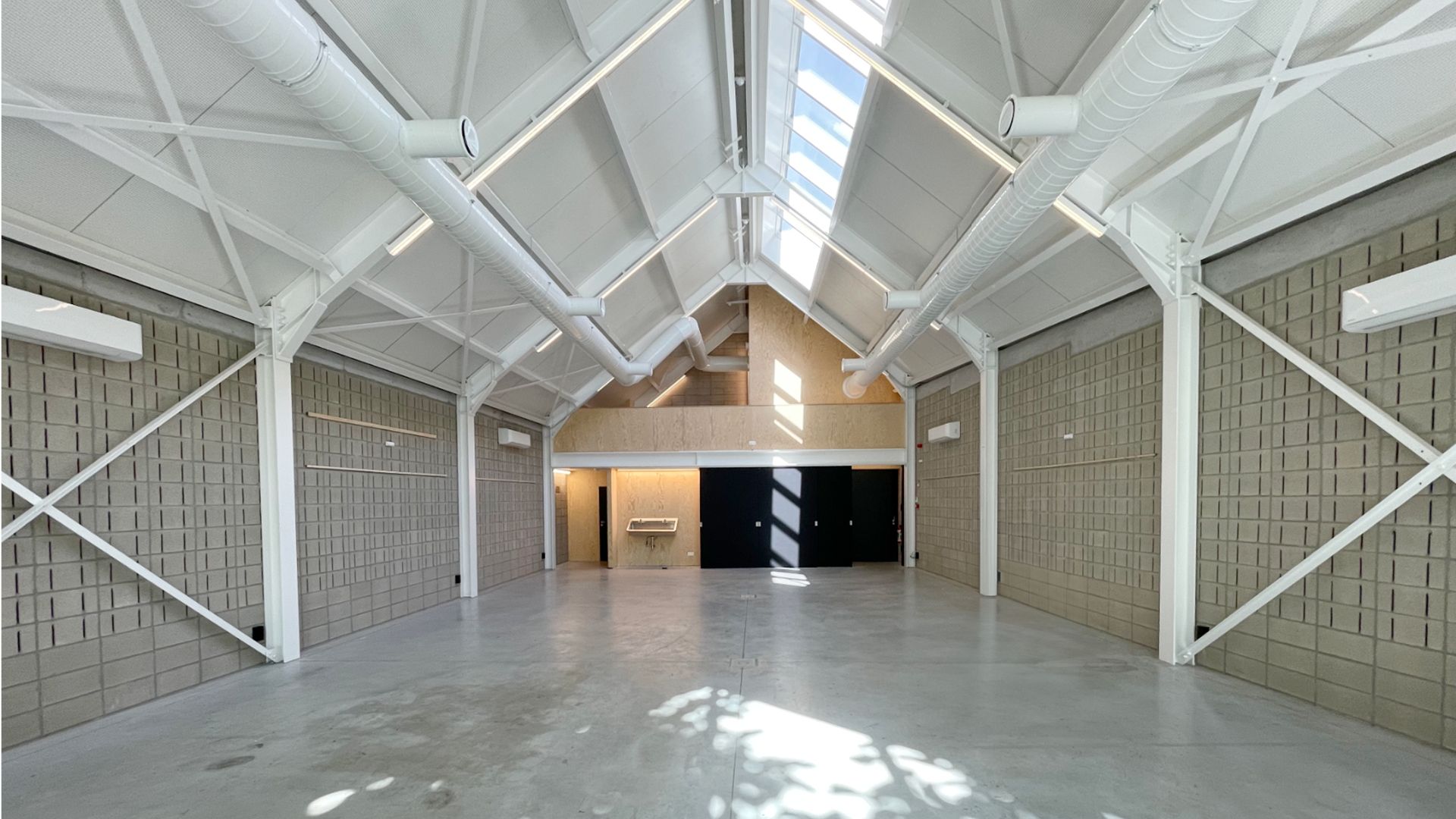 Le 'Hangar' existant dans la zone intérieure a été démoli. Il n'était pas adapté aux nouveaux besoins, ni structurellement et thermiquement. Les exigences acoustiques étant fixées en fonction de l'utilisation, il est équipé de murs, de panneaux de tôle profilée en acier et de vitrages, tous acoustiques.