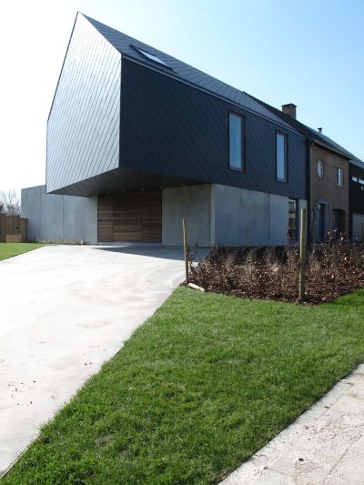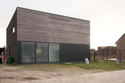 Tekst: <p>Pour rompre avec la volumétrie classique d’une habitation banale, une petite tour a été conçue et placée asymétriquement au rez-de-chaussée.</p><p>Côté ouest, un patio a été aménagé pour que la lumière du soir puisse pénétrer profondément. A l’arrière, le jardin, aménagé avec sobriété et entouré de lamelles, frappe le regard. Ces lamelles doivent conférer un sentiment de sécurité dans le paysage champêtre.</p><p>Pour souligner la verticalité de la maison, des lamelles verticales ont été choisies comme revêtement de façade. Les lamelles et les panneaux perforés sont en acier autopatinable.<br />Pour pouvoir placer l’ensemble de façade rapidement et simplement, des panneaux, qui peuvent atteindre 10 m2, ont été soudés l’un à l’autre au préalable en atelier, et accrochés d’un seul mouvement à la manière d’un portemanteau à la rive de toiture.Les lamelles de jardin sont hautes et donc soumises aux forces du vent. C’est pourquoi leurs bases ont été consolidées, les lamelles exécutées en 3 mm et l’ensemble fixé sur une console galvanisée souterraine. Les deux métaux ont été découplés avec un caoutchouc contre le courant galvanique.</p><p>De cette habitation émane une atmosphère particulière, qui contraste avec l’aspect banal du lotissement flamand.</p>
