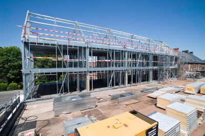Tekst: <p>Ce bâtiment de bureaux de 8 500 m² est destinéà l’extension des bureaux d’études de CMI Cockerill Maintenance & Ingénierie, logés actuellement dans le château de Seraing.</p><p>La structure est presque exclusivement constituée de poutres et de colonnes métalliques avec planchers en hourdis en béton précontraint et noyaux rigides en béton armé et post contraint.</p><p>L’ouvrage présente un important porte-à-faux dont la superficie totale de près de 2 000 m² est réparti sur trois niveaux. Il est composé de quatre poutres treillis de 25 à 35 m de portée s’appuyant l’une sur l’autre et dont la principale s’encastre dans un imposant voile-console en béton post contraint reposant directement sur le lit rocheux à dix mètres de profondeur. 350 tonnes d’acier S355 et S460 ont été nécessaires pour la construction de l’ouvrage, dont 150 tonnes pour les seules quatre poutres treillis du porte-à-faux. Ces dernières ont été réalisées entièrement en atelier, acheminées via la Meuse toute proche et montées sur chantier en quelques jours.</p>
