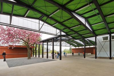 Tekst: <p>Pour ce projet qui comprend une école primaire, une école précoce, une structure d’accueil ainsi qu’un hall des sports, un ensemble d’auvents en acier a été réalisé dans la cour ainsi qu’au dessus de la rampe d’accès à l’école primaire. Ces structures légères et aérées combinent un système de poteaux de section ronde reliés par des traverses de section carrée et une ossature secondaire faite de tubes de section carrée supportant le bac de couverture. Une note de fantaisie est introduite par la disposition aléatoire des poteaux qui se prêtent parfaitement aux jeux d’enfants.</p>