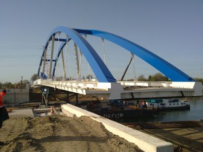 Tekst: <p>Afin de rendre nos voies d’eau intérieures navigables pour de gros porte-conteneurs à quatre niveaux, le gabarit en hauteur et la largeur du Canal Albert doivent être augmentés en de nombreux endroits. C’est notamment le cas à Oelegem, où un nouveau pont en arc ‘générique’ est en place depuis quelque temps.</p><p>La portée du pont d’Oelegem est de 104 m. Il y a deux bandes de circulation avec deux pistes cyclables latérales de 3 mètres. Le squelette du pont est complètement en acier S355 sauf les tirants qui sont des barres pleines en acier de très haute qualité (S520). La protection comprend un système à trois couches avec un DFT de 320 micromètre, tandis que les flasques sont galvanisés.</p><p>La tablier et l’arc furent totalement préfabriqués et acheminés sur ponton. Après assemblage par soudure des différents éléments en acier sur la berge, le squelette complet fut placé sur sa culée et parachevé.</p>