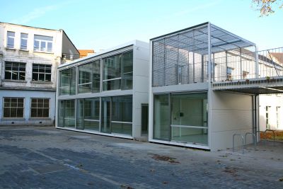 Tekst: <p>Située au cœur du village, l’extension de l’Ecole Communale d’Estaimpuis s’est opérée sous la forme d’une nouvelle construction à implanter à l’arrière du Centre de Lecture Publique d’Estaimpuis. Un parc avec quelques arbres centenaires forme le splendide décor végétal du fond de la parcelle. Les nouvelles salles de cours s’alignent sur le pignon existant, à la limite de la zone constructible pour ouvrir toutes les nouvelles classes vers le parc. Chaque classe bénéficie d’un niveau d’éclairement naturel généreux et d’un accès direct sous le préau. Sa structure métallique constituée très simplement de poutrelles galvanisées assemblées par boulonnage, rythme la façade et offre un espace couvert en dialogue avec le parc.</p>