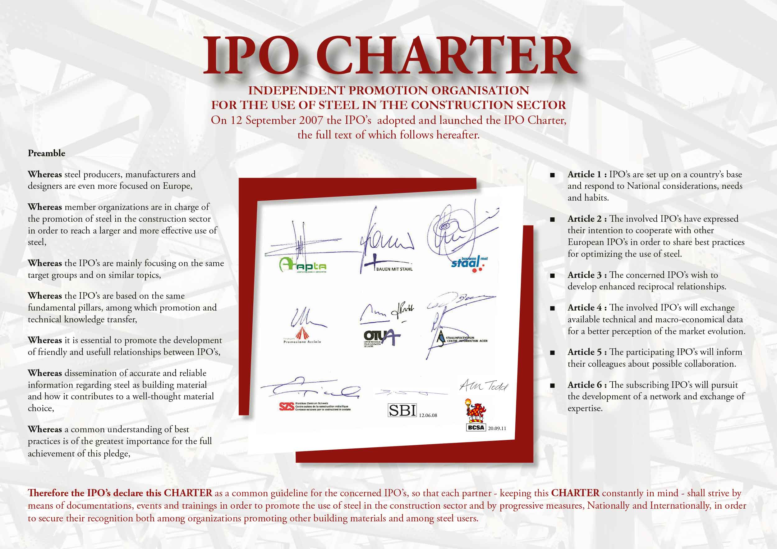 On September 16, 2007, Bouwen met Staal (The Netherlands), Infosteel (Belgium & Luxembourg), ConstruirAcier (France), bauforumstahl (Germany), Promozione Acciaio (Italy), APTA (Spain), SZS (Switserland), have signed a Charter as a common guidline.