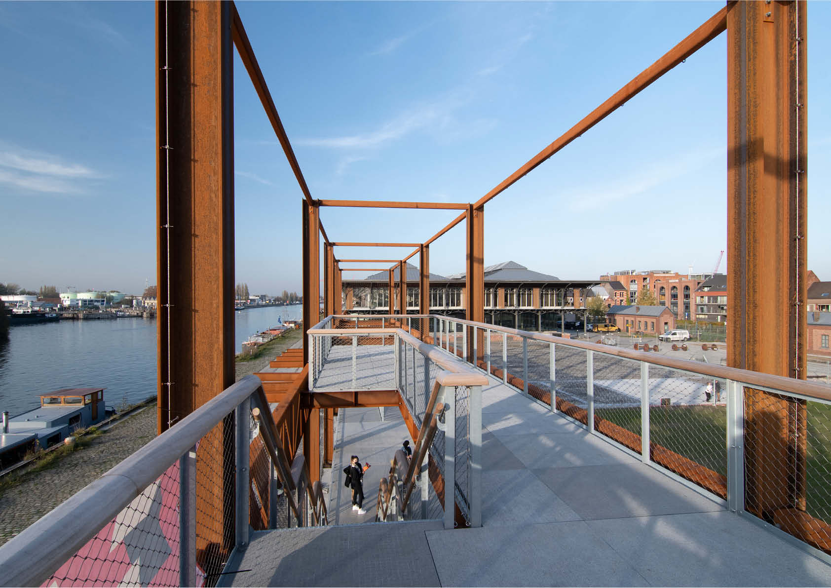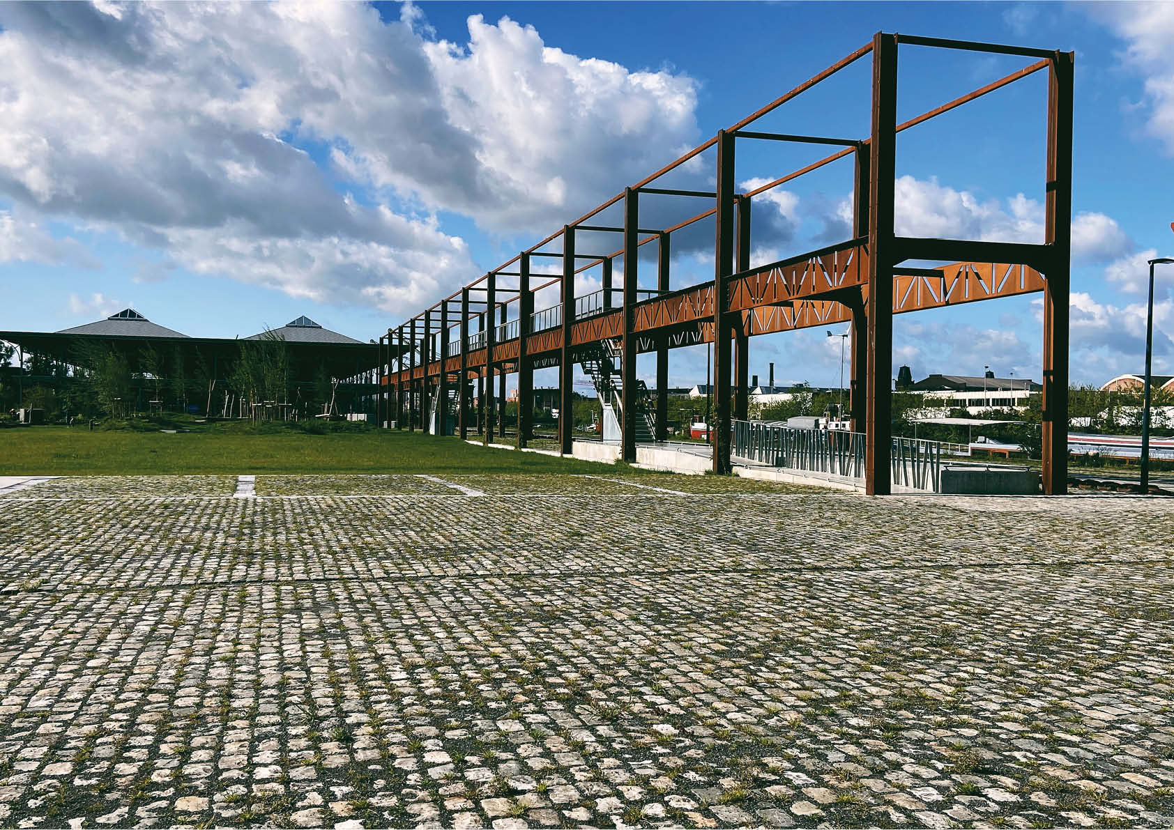 In het verlengde van de pergola, eveneens langs de kaaizijde, bevinden zich 2 lineaire tussenstructuren bestaande uit kolommen en vakwerkliggers met een overspanningen van zo’n kleine 10 m.